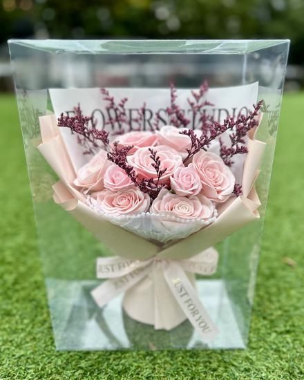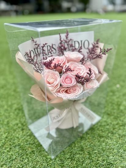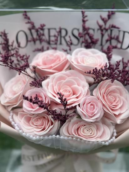 花びら部分が石鹸素材で作られた、優しい香りのソープフラワーがブーケになっています。